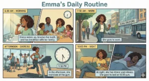 Reading: Emma’s Daily Routine Emma is a very active person. She wakes up at 6:30 every day. She gets up, brushes her